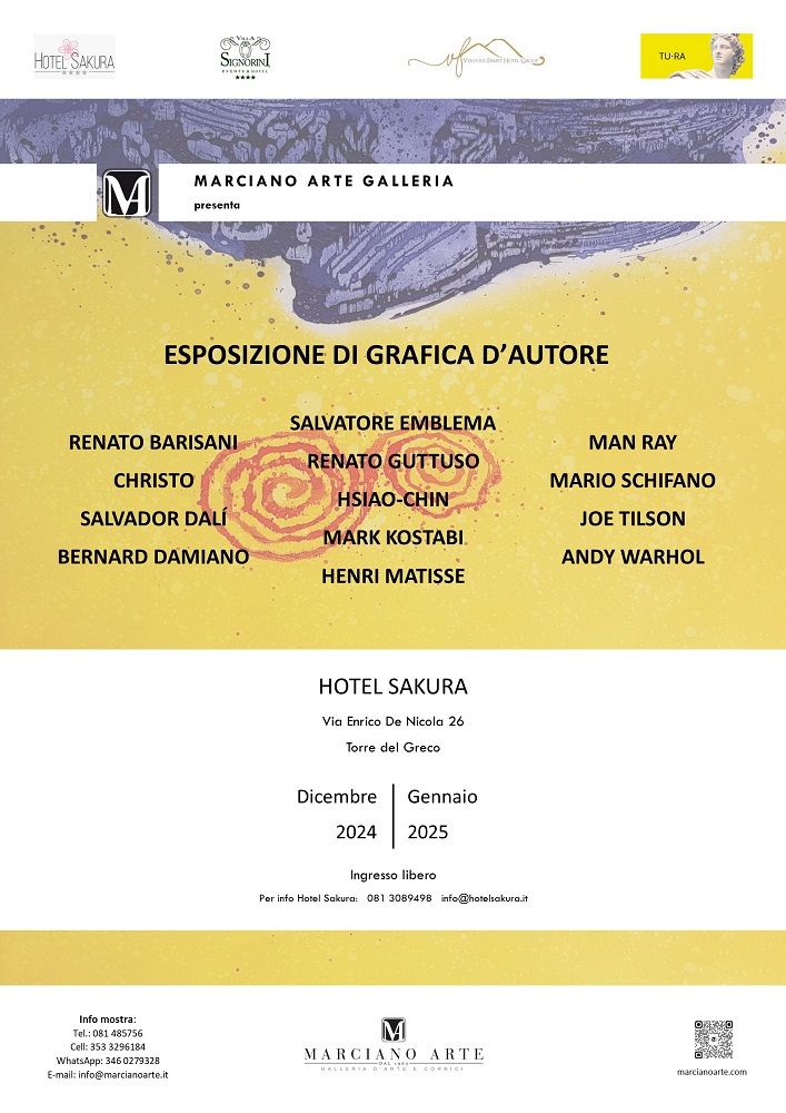 Venerdì 20 dicembre 2024 alle ore 19.00, nella splendida location dell’Hotel Sakura a Torre del Greco, si terrà l’evento di presentazione dell’Esposizione di Grafica d’Autore con le opere grafiche degli artisti Renato Barisani, Christo, Salvador Dalì, Bernard Damiano, Salvatore Emblema, Renato Guttuso, Hsiao-Chin, Mark Kostabi, Henri Matisse, Man Ray, Mario Schifano, Joe Tilson, ed Andy Warhol. Con l’occasione brinderemo ad un sereno Natale con gli amici che vorranno onorarci della loro presenza.