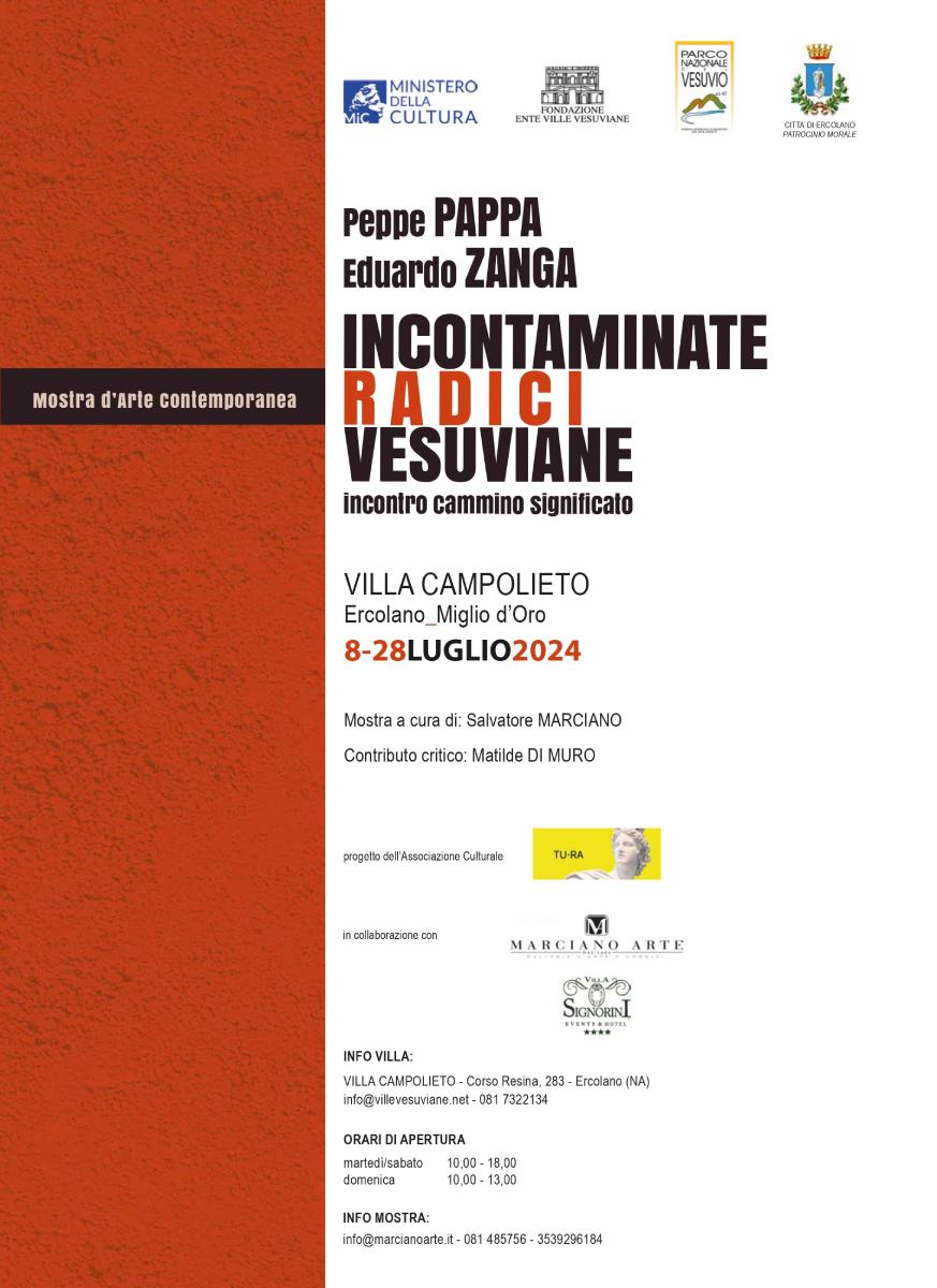 Locandina della mostra d'Arte Contemporanea "Incontaminate Radici Vesuviane" di Peppe Pappa e Eduardo Zanga a Villa Campolieto in Ercolano dal 8 al 28 luglio 2024