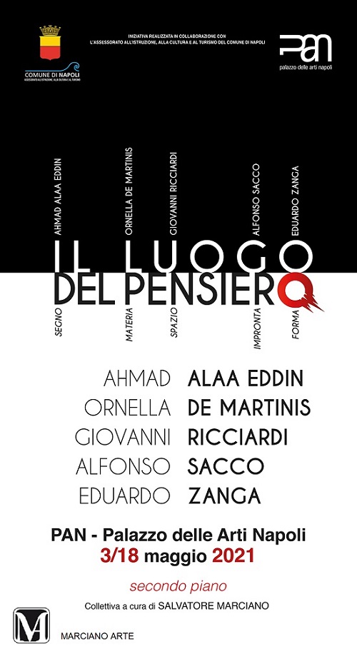 Dal 3 e fino al 18 maggio 2021 si svolge presso il PAN di Napoli la mostra “Il Luogo del Pensiero”, iniziativa realizzata in collaborazione con l’Assessorato all’Istruzione, alla Cultura e al Turismo del Comune di Napoli, che presenterà opere degli artisti Ahmad Alaa Eddin, Ornella De Martinis, Giovanni Ricciardi, Alfonso Sacco, Eduardo Zanga.